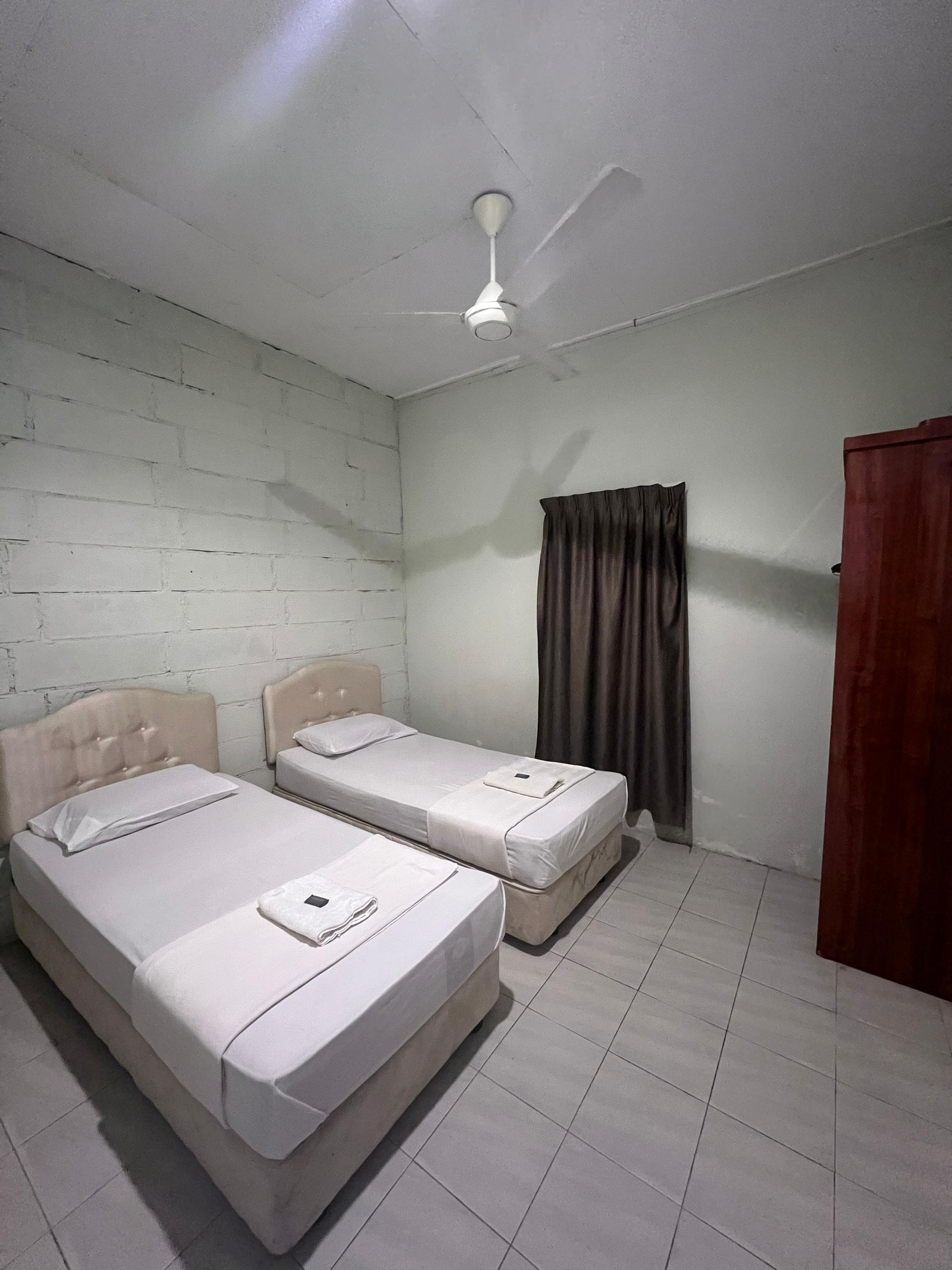 Bilik dengan kipas siling, 2 katil single & tandas berasingan